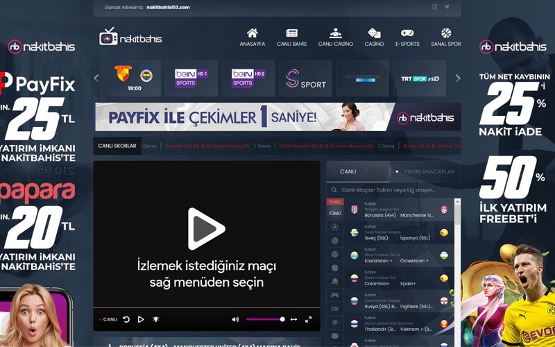 Canlı maç izle Nakitbahis sitesi üzerinden ücretsiz bir şekilde yaralanabileceğiniz hizmetler arasında yer alıyor. Alternatiflerine yüksek ücretler ödemeniz gerekirken Nakitbahis adresinde hiçbir ücret ödemenize gerek kalmaz. Tamamen ücretsiz olarak güvenilir bahis sitesi Nakitbahis’e giriş yaparak istediğiniz müsabakayı izleyebilirsiniz. Geniş ağı sayesinde neredeyse bütün spor müsabakalarını internet sitemizde bulmanız da mümkün. Futbol maçları, Basketbol maçları, Tenis karşılaşmaları, Voleybol maçları ve aklınıza gelebilecek bütün spor dallarındaki maçları en iyi canlı bahis siteleri arasında yer alan sitemizden ücretsiz şekilde izleyebilirsiniz. Dijital platformlardan bu maçların hepsini izlemek için çok fazla para ödemeniz gerektiği oldukça açıktır. Üstelik sadece futbol karşılaşmalarının turnuvalarına göre farklı dijital platformlarına üye olmanız ve tabii ki para ödemeniz gerekmektedir. Canlı maç nasıl izlenir sorusunun cevabı için Nakitbahis TV’ye tıklayın.